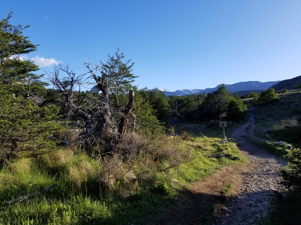 Those strenuous for me three kilometers were worth it when I arrived at the Mirador Laguna Torre, a viewpoint that gave me my first taste of the mountains, especially Cerro Torre off in the distance and the forest spread out before me. It was an inspiring sight to see, and the weather was perfect- sunny and clear. After taking it all in for several minutes, and wanting to stay ahead of the groups that were starting to catch up to me, I continued on. After climbing up for the first three kilometers of the hike, the trail after the viewpoint descends for about another kilometer, which I welcomed, though mindful that I would have to ascend the trail on the way back.