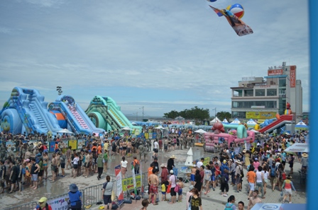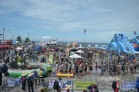 The Boryeong Mud Festival is held in South Korea every year for roughly the last two weeks of July. It’s supposed to be one of the biggest festivals South Korea offers, and in particular it is very popular with foreigners. Based on my experience, I say both of those statements are absolutely true. The mud festival is held on Daecheon Beach which is about a two and a half hour train ride (or drive if you are bold enough to drive in South Korea-I’m not) south of Seoul. It is extremely convenient to reach, because there are numerous trains leaving daily from Yongsan Station for Daecheon. During the festival, there is a bus from the train station to the beach approximately every 10 minutes, and it is roughly a 20 minute bus ride to the beach and festival site. The centerpiece of the festival is the Mud Play Zone at Mud Plaza. Surrounding the plaza are a variety of different experience booths, and all of this is set right next to a very large, popular sandy beach. The mud play zone is actually divided into two areas: the paid zone and the family zone. Both of them charge admission to enter. However the family zone is for families with kids the age of 13 and younger, and the paid zone is for those over the age of 13. The play times are divided into two blocks of time: the morning session of of 9:30-13:20 and the afternoon session from 14:10-18:00. I bought an all day, adult ticket and that cost me only 10,000 won (less than $10 USD). It’s a lot of fun, but just be prepared for crowds, long lines, and most of all, to get EXTREMELY muddy if you so desire (trust me, you do).