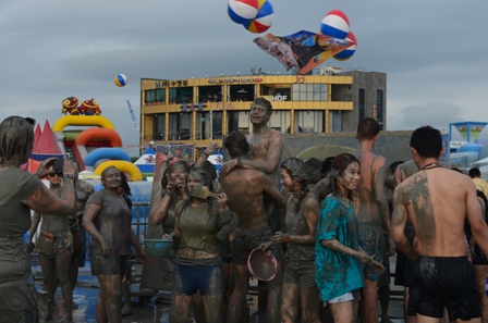 While the Boryeong Mud Festival is geared toward all ages, at times, it definitely felt like Spring Break: Daecheon Beach. Like I mentioned, this is a very popular festival with groups of twentysomethings. They are there to strip down (to tiny swimsuits, not naked-this is Korea after all), booze up, get muddy and dance on the beach. The only thing missing were the MTV cameras, though there was plenty of local press on hand capturing all the insanity. However, if that part is just not your thing, there is still plenty of fun to be had at the festival. In addition to the mud play zone, there were some experience booths like I’ve seen in other culture festivals. You can play with colored mud (in a much more controlled setting than the mud play zone). You can buy beauty products made from local Boryeong mud (in fact this festival’s origins trace to trying to promote the health and beauty benefits of the local mud and its products). You can make your own mud soap, get your face painted and just enjoy some relaxing time on the (very crowded) beach.