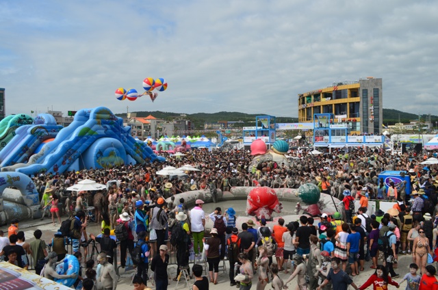Everything you want for the festival is all within a very small walking area. There are showers for a fee, though I warn you these are open bay showers crowded with many, many people and not private shower stalls. If you don’t mind showering, toweling off and dressing pressed up against a group of strangers, dive right in. At least the showers are segregated by gender. There is a place to store your bags during the day for a small fee. I highly recommend you store almost everything, but carry around your wallet and phone in a waterproof case. The bathrooms on site are what you would expect from such a widely attended festival (i.e. a bit scary as the day progresses). Food and beverages are available on site, and if you choose to stay overnight, there are many hotels in Daecheon Beach. Though I recommend you book well in advance and not assume you’ll be able to walk up the day of and get a room, particularly for a beachside hotel.