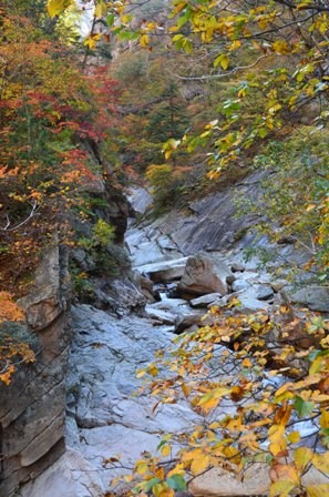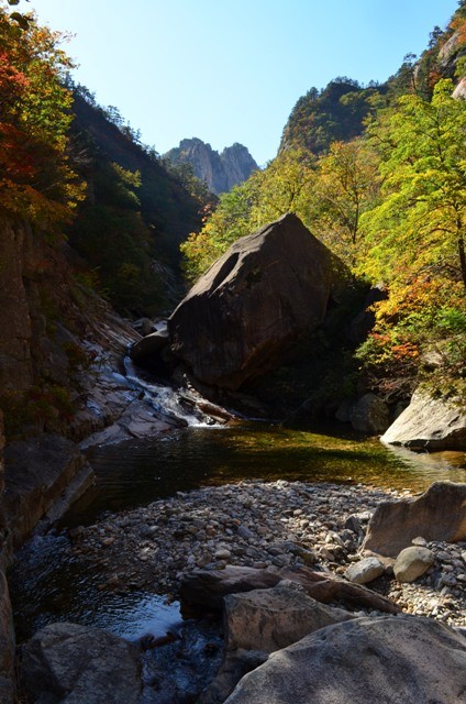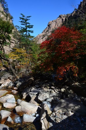 I picked Seoraksan as my first hiking weekend, both because I had a long weekend to do all the hikes I wanted in the time available, and it was also supposed to be the first national park to hit peak color for autumn foliage in the middle of October. I had visions of seeing the entire hills covered in red, orange and yellow. What I found was a bit different. Due to the warm weather this, the advent of fall seems to be delayed in Korea. It was the middle of October, and while there were leaves changing, it was not as much as I expected. But I valiantly set out in search of autumn colors.