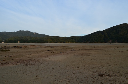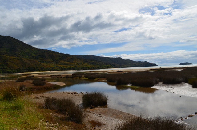 The tracks went up hills and down hills in the forest, and I don’t know if the hills were steeper that day, but I was definitely feeling it more. My daily walk was 11.5 kilometers and it took me about four hours. Finally, the track turned to actual beach walking for part of the way. There was a 1 kilometer stretch along Onetahuti Beach, and the last 20 minutes along Awaroa Inlet to the hut.